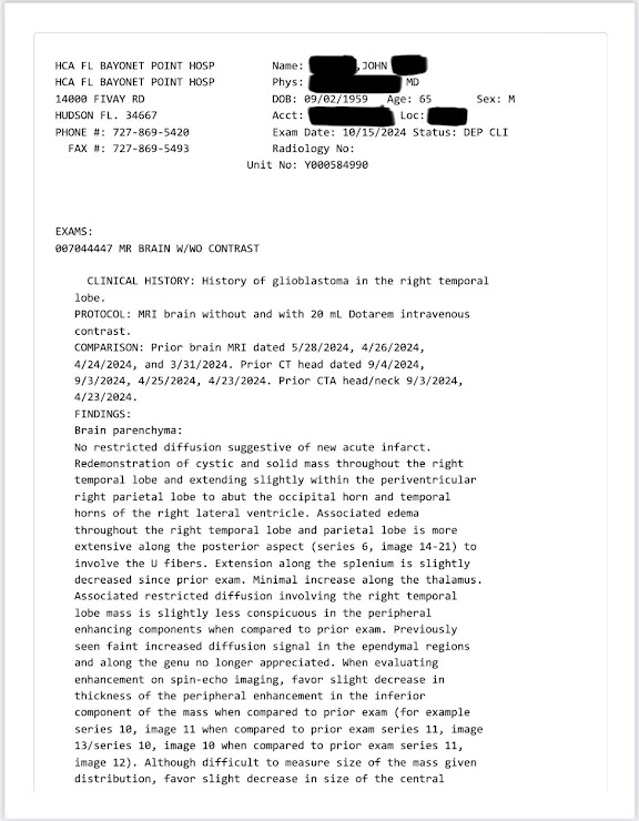 Odczyt wyników został opublikowany!! Jest wiele rzeczy, których NIE rozumiem, ale rozumiem wystarczająco dużo, aby zobaczyć, że NASTAŁA POPRAWA!! Doceniam wszystkie modlitwy i życzenia! Dla wszystkich, którzy nie są na bieżąco – u mojego taty zdiagnozowano glejaka wielopostaciowego w kwietniu tego roku. Ukończył jedną pełną serię chemioterapii i radioterapii, a na początku sierpnia nie czuł się dobrze. Nie będę wdawał się w szczegóły. Jednak przeprowadziłem wiele badań i jedną z NIESAMOWITYCH stron, które tutaj znalazłem, była @JohnDParody. Wybrałem protokół, który uznałem za najlepszy i zacząłem podawać tacie iwermektynę i fenbendazol. Kontynuował chemioterapię, ale jestem w 100% przekonany, że to właśnie jej stosowanie w połączeniu z iwermektyną i fenbendem doprowadziło go do miejsca, w którym jest dzisiaj. Byłem tam i obserwowałem, jak codziennie się poprawia. Nie mam zdjęć samych skanów, ponieważ nie są zamieszczone na portalu. Ale jeśli ktoś chciałby porównać je z którymś ze swoich poprzednich odczytów, mogę je również zdobyć. Idę świętować z moim tatą.