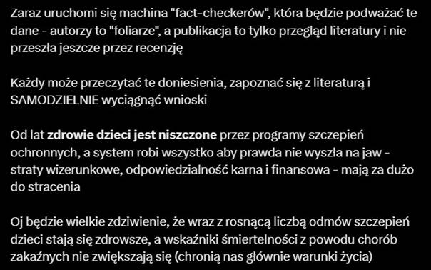 Polecam też moje felietony: Uchwała zamiast wolności badań, Nawet nie potrafili dosypać! Przestępca w fotelu? Wariant rumuński? Skandaliczne kłamstwo, Cierpliwość Brauna, Czas otrzeźwienia, Cenzura ignorantów, Sejmowa dintojra, Wszyscy będą siedzieć! Braun do Watykanu, Oklaski dla Brauna, Wielbłąd Kaczyńskiego, Przedwyborcza histeria pacynek, Podżeganie do pokoju, Elektryczne szaleństwo, Kaganiec oświaty, Antidotum na wirusy, Tydzień z hukiem, Ruskoonucyzm patriotyczny, Raszyńska masakra i czerwony diabeł, Obłędna miłość, Igrzyska śmierci w cieniu Pekinu, Klątwa Kurskiego i australijski skandal, Pudrowanie trupa i gry szpitalne, Strzały na granicy! Grobbing 2.0 i Halloween, Zjedz szczepionkę, Gladiator i dziewczyny, Turniej US Open Closed, Wymyk do podporu, Szczepionkowa propaganda nie działa! Szczepionkowe wakacje z QR kodem, Szczepionkowa schizofrenia, Największy przekręt i co dalej? Zabijamy ludzi, Złoty strzał dla seniora, To już nie teorie spiskowe! Uratowani przez Covid?