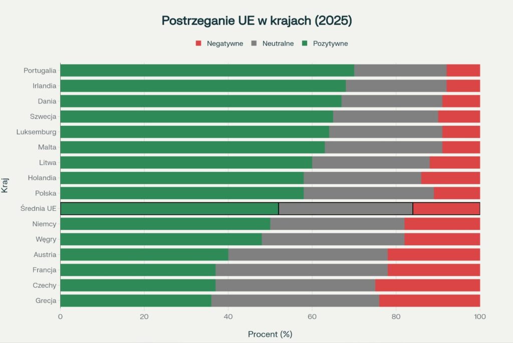 Według Eurobarometru 2025 przekonanie o korzyściach z członkostwa różni się znacząco między krajami: oko
