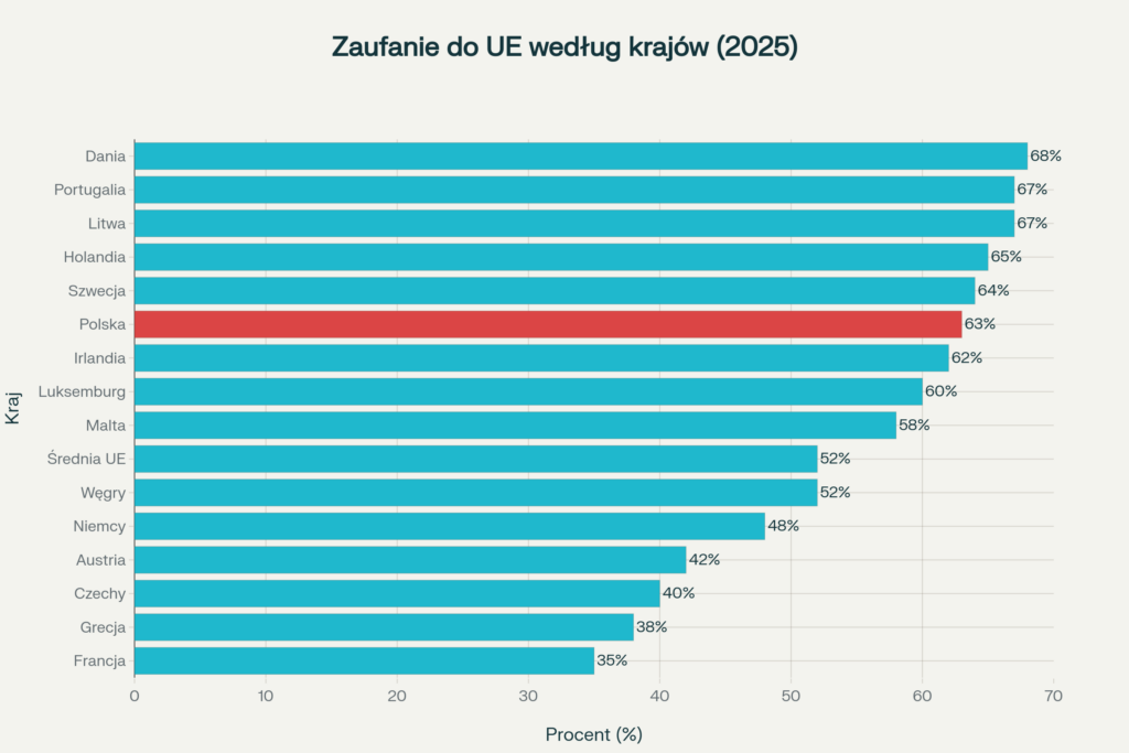 Zaufanie do Unii Europejskiej w wybranych krajach członkowskich (Eurobarometr 2025)