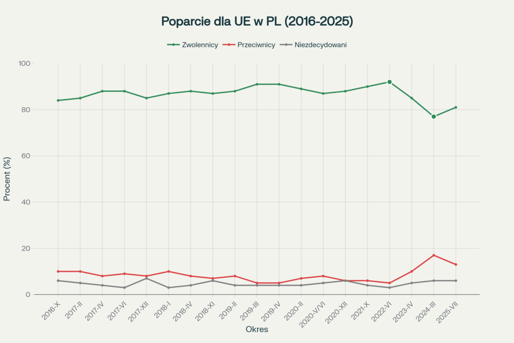 W ciągu ostatniej dekady poparcie Polaków dla członkostwa w UE utrzymywało się na wyjątkowo wysokim poziomie. Według systematycznych badań CBOS odsetek zwolenników obecności Polski w Unii przez większość tego okresu oscylował między 84% a 91%.cbos